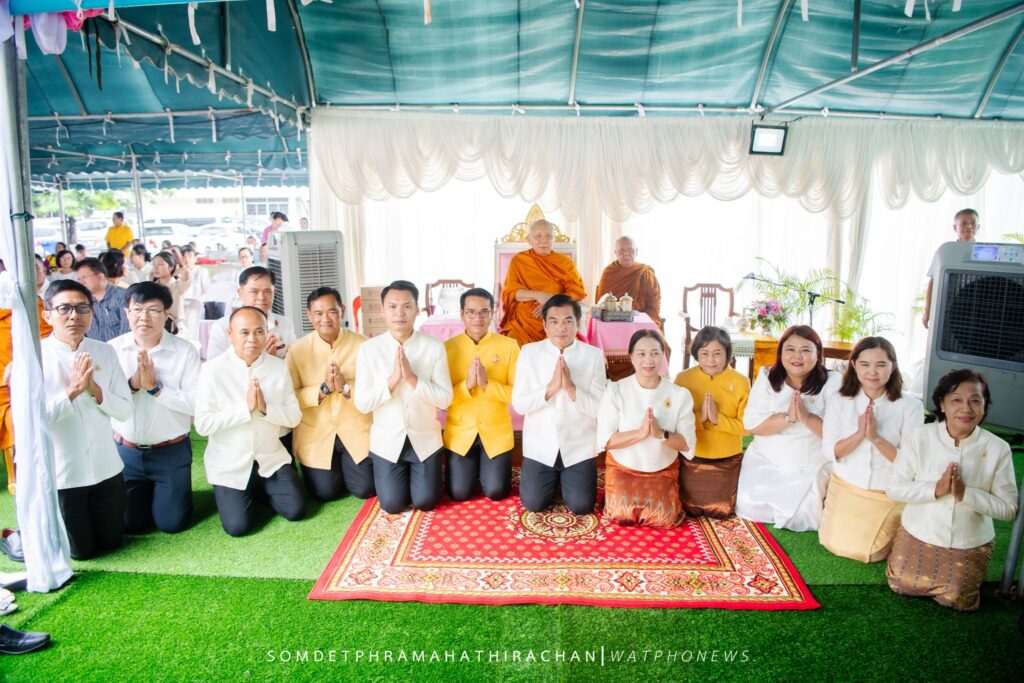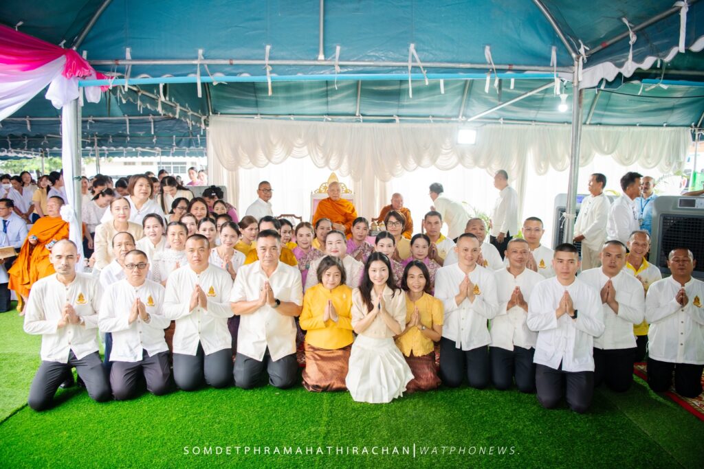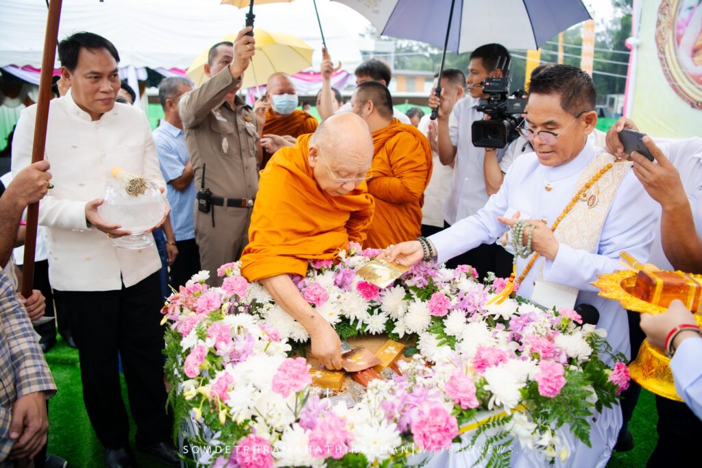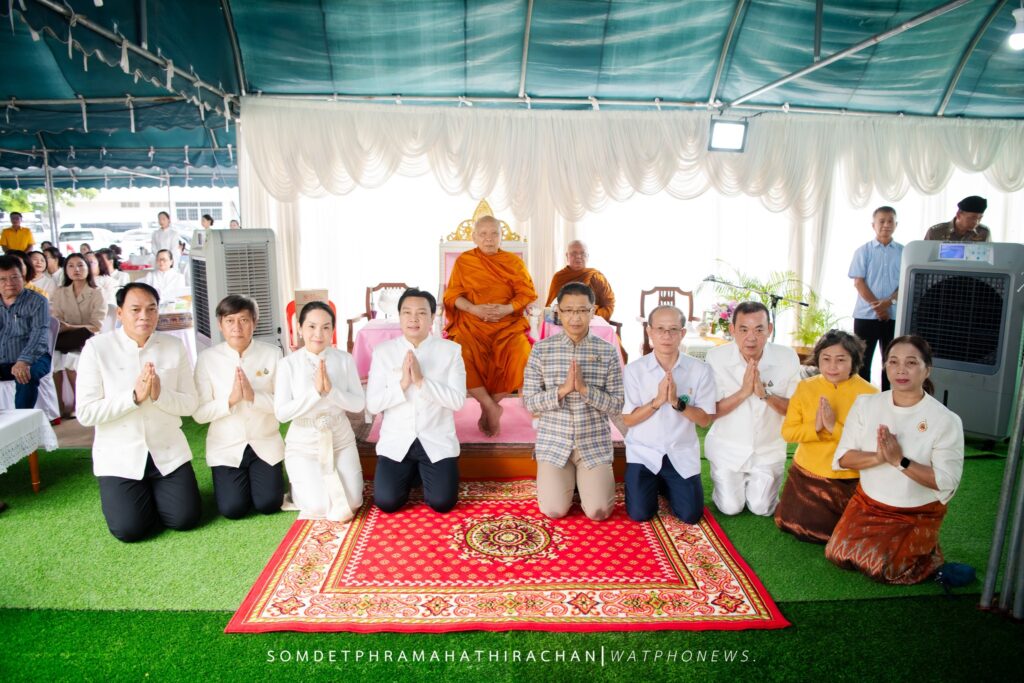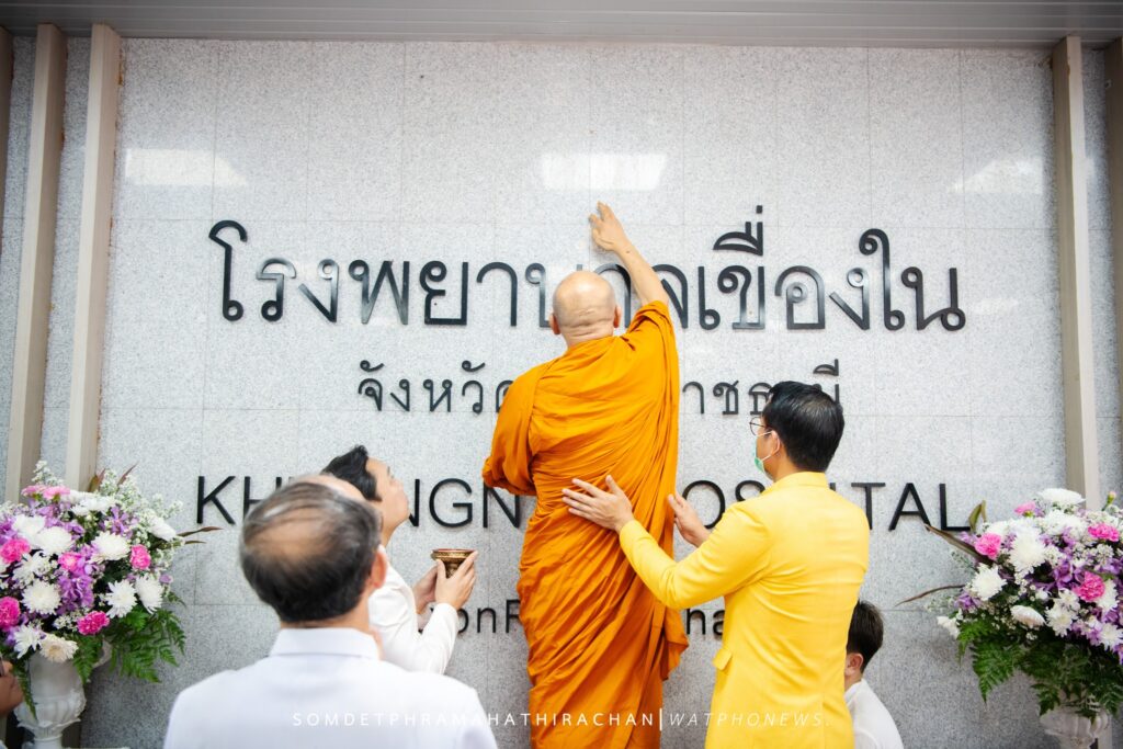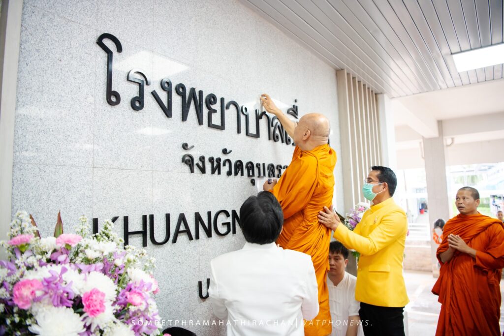 เสร็จพิธีแล้ว สมเด็จพระมหาธีราจารย์ เมตตาเจิมป้ายอาคารของโรงพยาบาลเขื่องใน (Khuang Nai Hospital) จังหวัดอุบลราชธานี เพื่อความเป็นสิริมงคล ในคราวเดียวกันด้วย