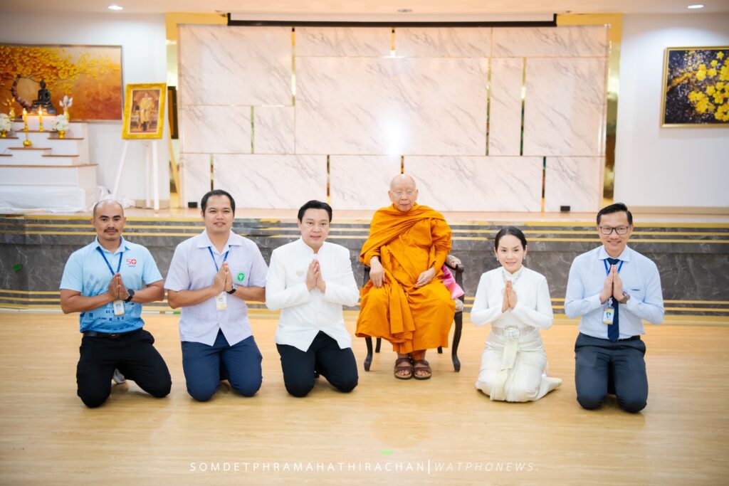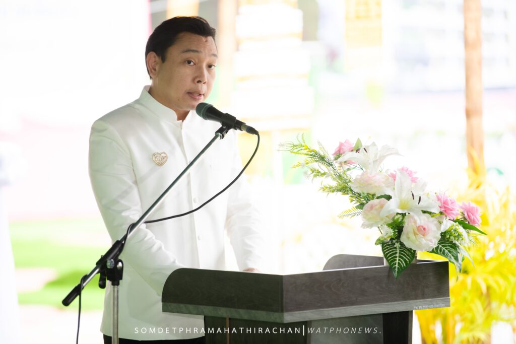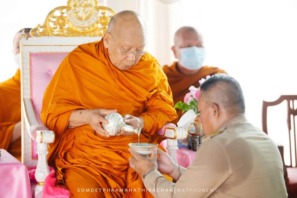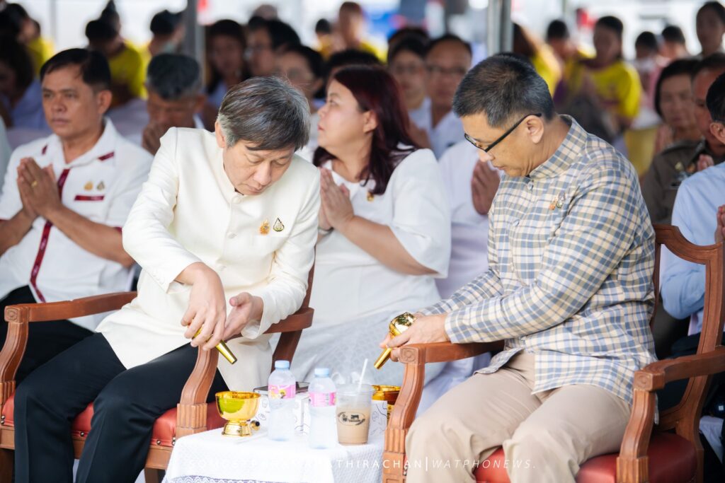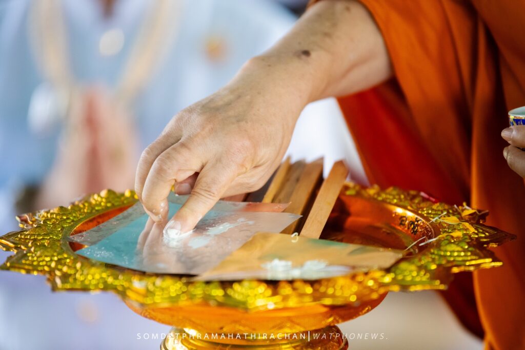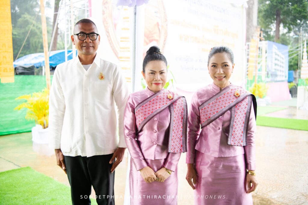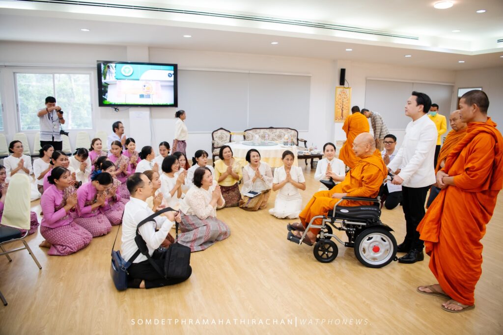 เสร็จพิธีแล้ว สมเด็จพระมหาธีราจารย์ เมตตาเจิมป้ายอาคารของโรงพยาบาลเขื่องใน (Khuang Nai Hospital) จังหวัดอุบลราชธานี เพื่อความเป็นสิริมงคล ในคราวเดียวกันด้วย