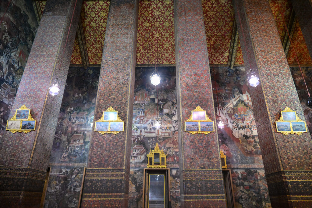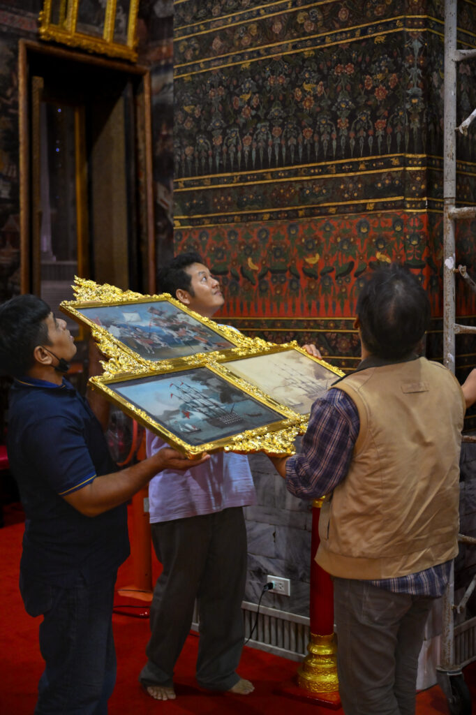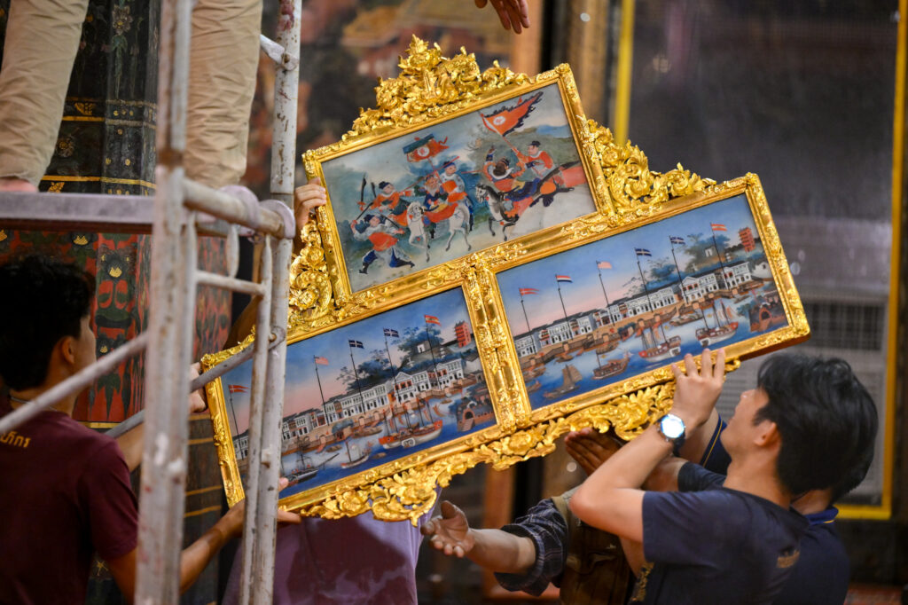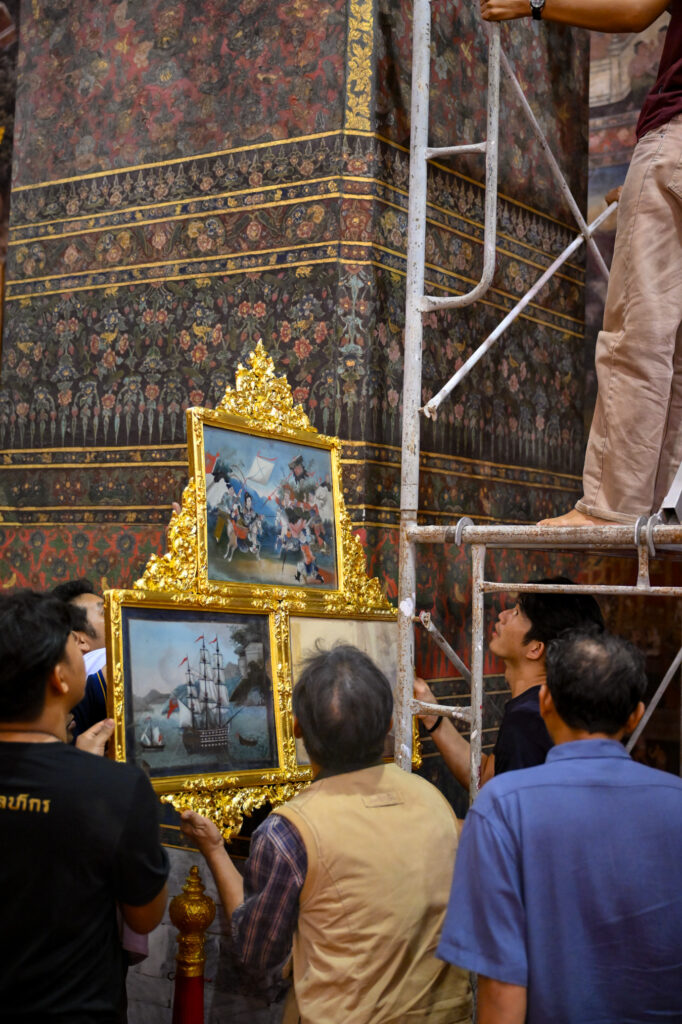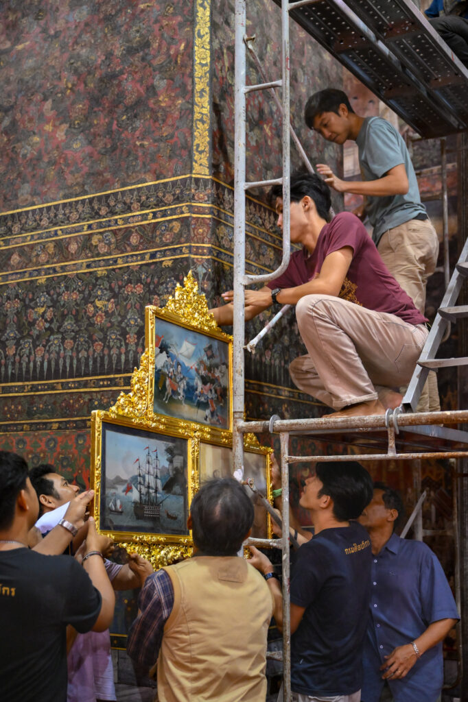 ภาพเขียนสีที่ได้รับการบูรณะในครั้งนี้ เป็นผลงานจิตรกรรมบนแผ่นกระจกที่ประดับอยู่ตามเสาภายในพระอุโบสถ แสดงเรื่องราววรรณกรรมจีนเรื่อง สามก๊ก และภาพ “ฝรั่งสิบสามห้างในเมืองกวางเจา มณฑลกวางตุ้ง” ซึ่งถ่ายทอดภาพวิถีชีวิตและการค้าขายระหว่างประเทศในอดีตกาลอย่างงดงาม สมบูรณ์ด้วยคุณค่าทางศิลปะและประวัติศาสตร์