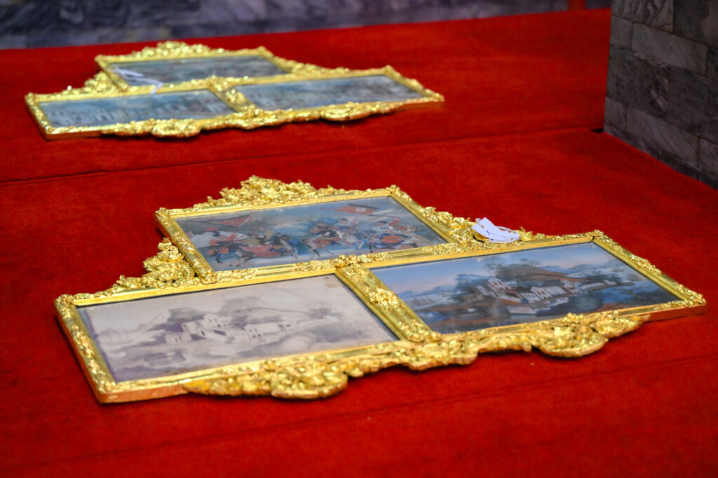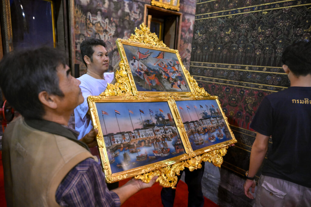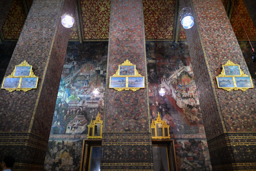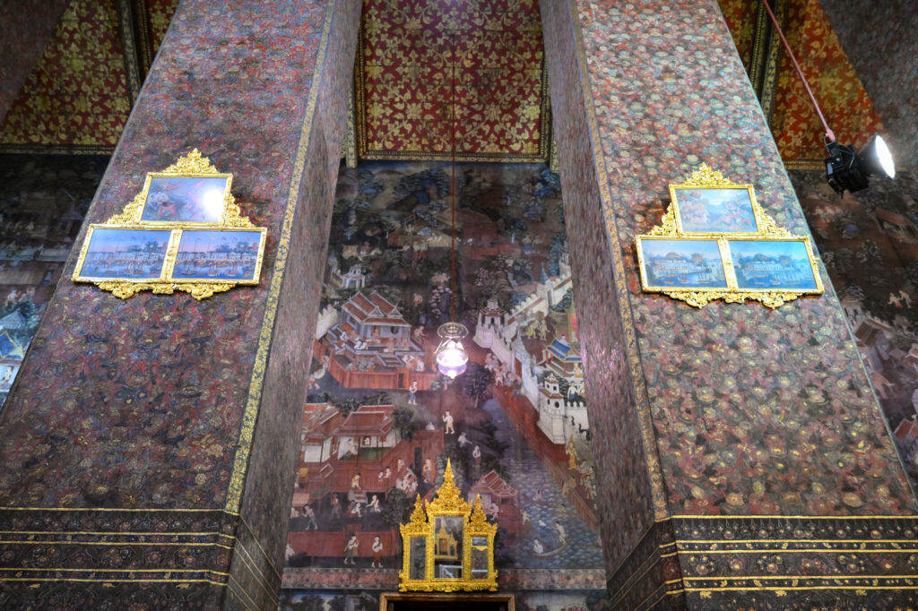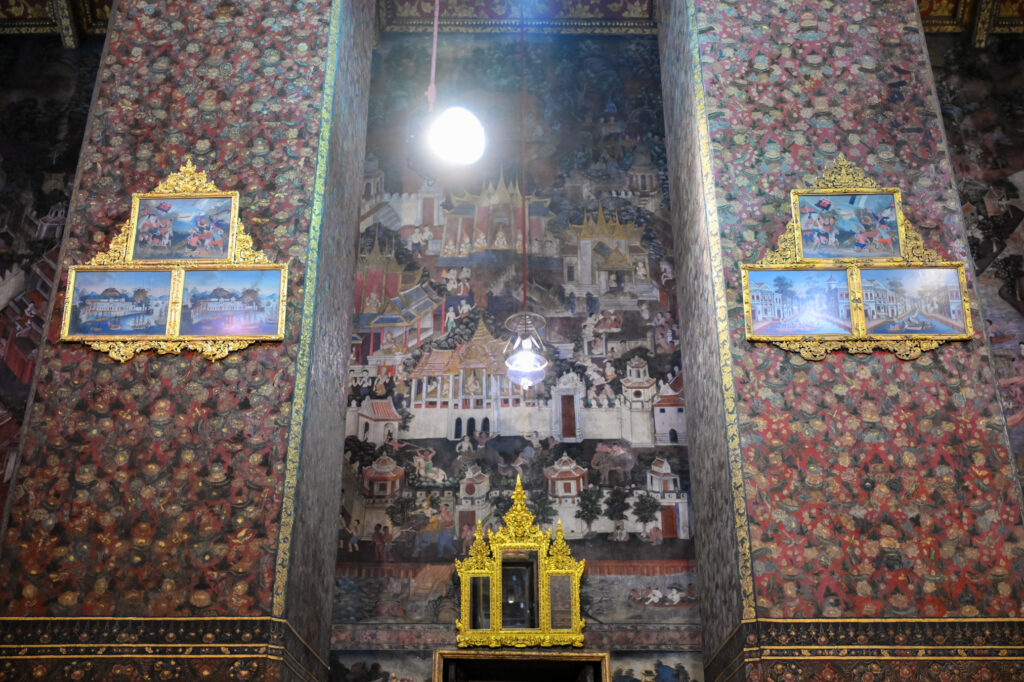 ภาพเขียนสีที่ได้รับการบูรณะในครั้งนี้ เป็นผลงานจิตรกรรมบนแผ่นกระจกที่ประดับอยู่ตามเสาภายในพระอุโบสถ แสดงเรื่องราววรรณกรรมจีนเรื่อง สามก๊ก และภาพ “ฝรั่งสิบสามห้างในเมืองกวางเจา มณฑลกวางตุ้ง” ซึ่งถ่ายทอดภาพวิถีชีวิตและการค้าขายระหว่างประเทศในอดีตกาลอย่างงดงาม สมบูรณ์ด้วยคุณค่าทางศิลปะและประวัติศาสตร์