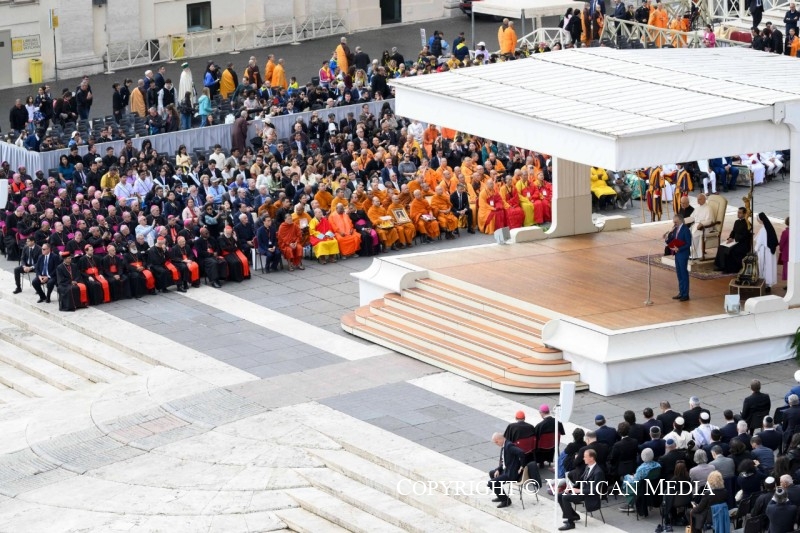 สมเด็จพระสันตะปาปาเลโอที่ 14 ทรงจบท้ายพระดำรัสด้วยพระวาจาของสมเด็จพระสันตะปาปานักบุญยอห์น ปอลที่ 2 ซึ่งตรัสที่เมืองอัสซีซีในปี ค.ศ. 1986 ว่า : “หากโลกจะดำเนินต่อไป และชายและหญิงจะอยู่รอดในโลกนี้ได้ โลกก็ไม่อาจขาดการอธิษฐานไปได้” ดังนั้น พระองค์จึงทรงเชิญชวนทุกคนให้หยุดนิ่งพร้อมกันในการภาวนาเงียบๆ ด้วยบทวิงวอนว่า : “ขอให้สันติสุขลงมาเหนือเราและเติมเต็มจิตใจของเรา”