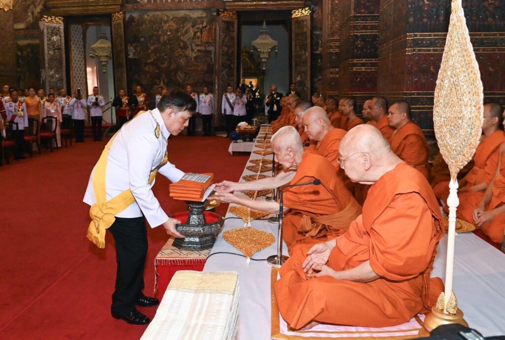 ต่อจากนั้น ทรงหยิบผ้าห่มสำหรับพระประธาน พระราชทานเจ้าพนักงานภูษามาลา จากนั้น เจ้าพนักงานกรมการศาสนากราบบังคมทูลรายงานจำนวนพระสงฆ์ จบแล้ว ทรงหยิบผ้าไตรที่พานแว่นฟ้าพาดระหว่างพระกร ทรงกล่าวคำถวายผ้าพระกฐิน ทรงวางผ้าไตรไว้บนพานแว่นฟ้าที่เดิม ทรงประเคนผ้าไตรและเทียนปาฏิโมกข์แด่พระสงฆ์รูปที่ 2
