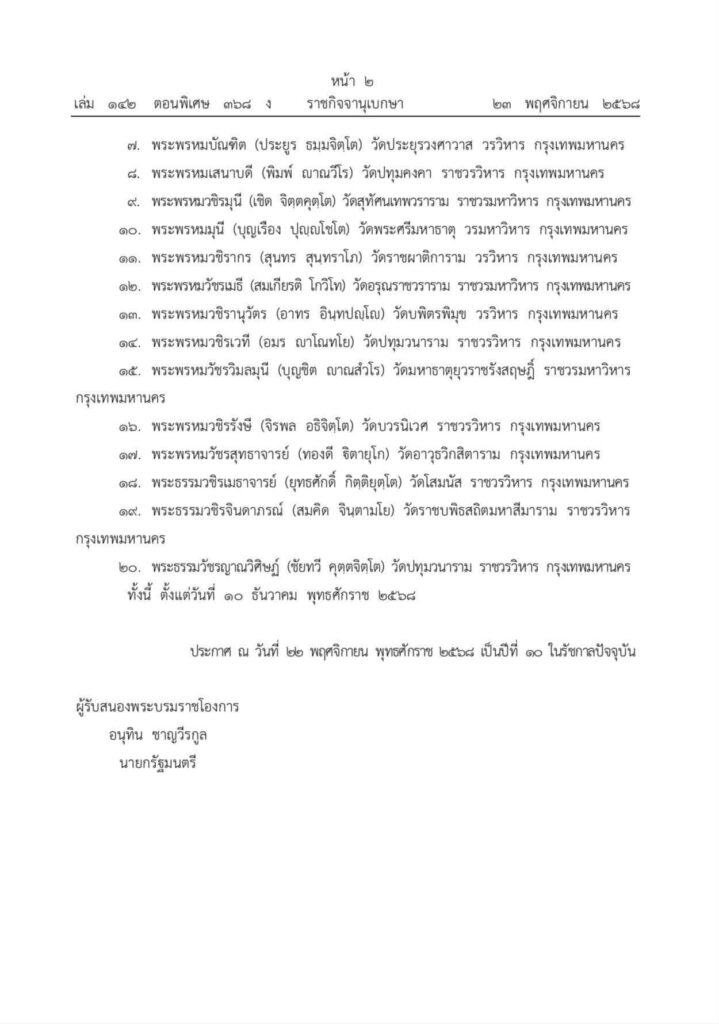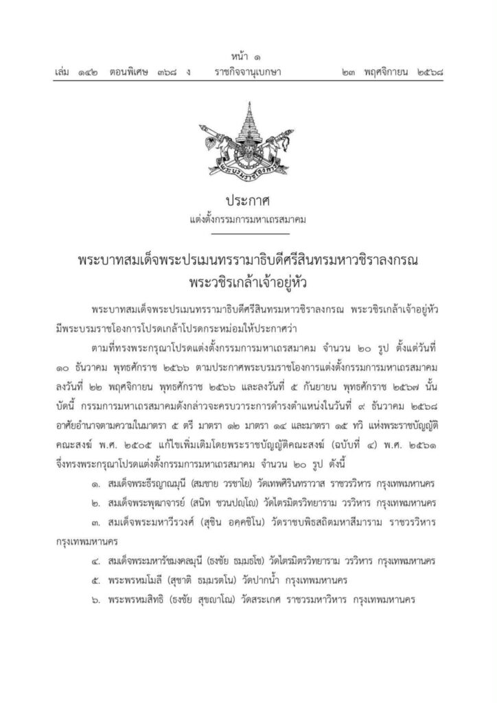 วันที่ 23 พ.ย. 2568 เว็บไซต์ราชกิจจานุเบกษา เผยแพร่พระบรมราชโองการ ประกาศแต่งตั้งกรรมการมหาเถรสมาคม (มส.) ระบุว่า พระบาทสมเด็จพระปรเมนทรรามาธิบดีศรีสินทรมหาวชิราลงกรณ พระวชิรเกล้าเจ้าอยู่หัว มีพระบรมราชโองการโปรดเกล้าโปรดกระหม่อมให้ประกาศว่า ตามที่ทรงพระกรุณาโปรดแต่งตั้งกรรมการมหาเถรสมาคม จำนวน 20 รูป ตั้งแต่วันที่ 10 ธันวาคม 2566 ตามประกาศพระบรมราชโองการแต่งตั้งกรรมการมหาเถรสมาคม ลงวันที่ 22 พฤศจิกายน 2566 และลงวันที่ 5 กันยายน 2567 นั้น