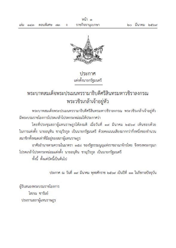 วันที่ 20 มีนาคม 2569 พระบาทสมเด็จพระปรเมนทรรามาธิบดีศรีสินทรมหาวชิราลงกรณพระวชิรเกล้าเจ้าอยู่หัว มี พระบรมราชโองการ โปรดเกล้าโปรดกระหม่อม ให้ประกาศว่า