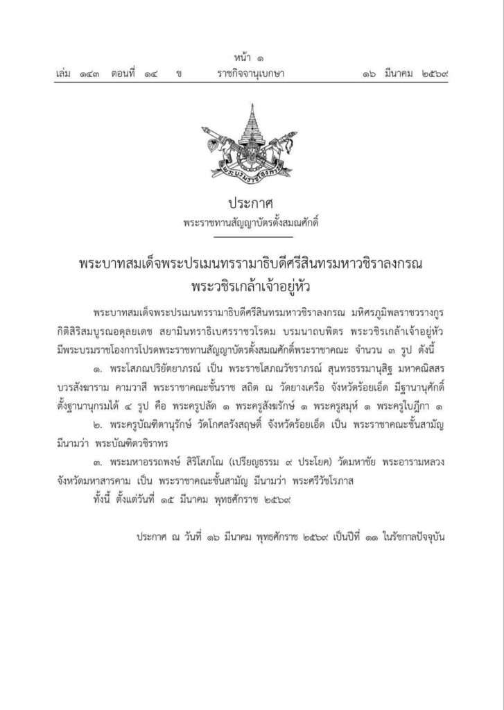 มีพระบรมราชโองการโปรดพระราชทานสัญญาบัตรตั้งสมณศักดิ์พระราชาคณะ จำนวน 3 รูป ดังนี้