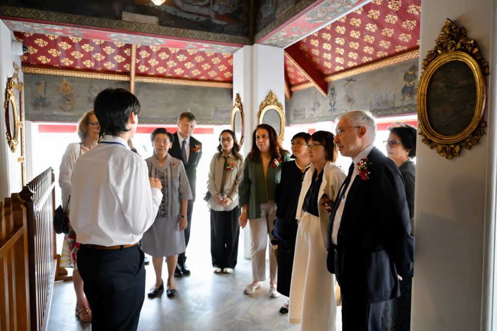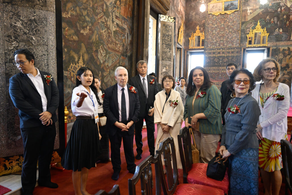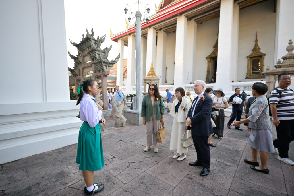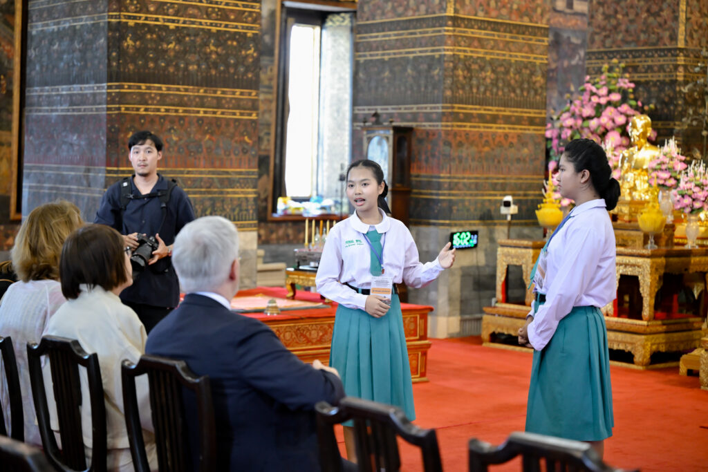 ก่อนการมอบเกียรติบัตรฯ นักเรียนที่ผ่านการอบรมฯ ได้ทำหน้าที่เป็นล่าม นำคณะทูตฝรั่งเศส ชมสถานที่ศักดิ์สิทธิ์สำคัญต่างๆ ภายในวัดโพธิ์ ท่าเตียน เริ่มจาก พระอุโบสถ พระระเบียงคต เขามอ-ฤาษีดัดตน พระมหาเจดีย์ 4 รัชกาล วิหารพระนอน (พระพุทธไสยาสน์) พระมณฑป สระจระเข้ และศาลาการเปรียญหลังโบราณเก่าแก่ บูรณะใหม่สวยงาม
