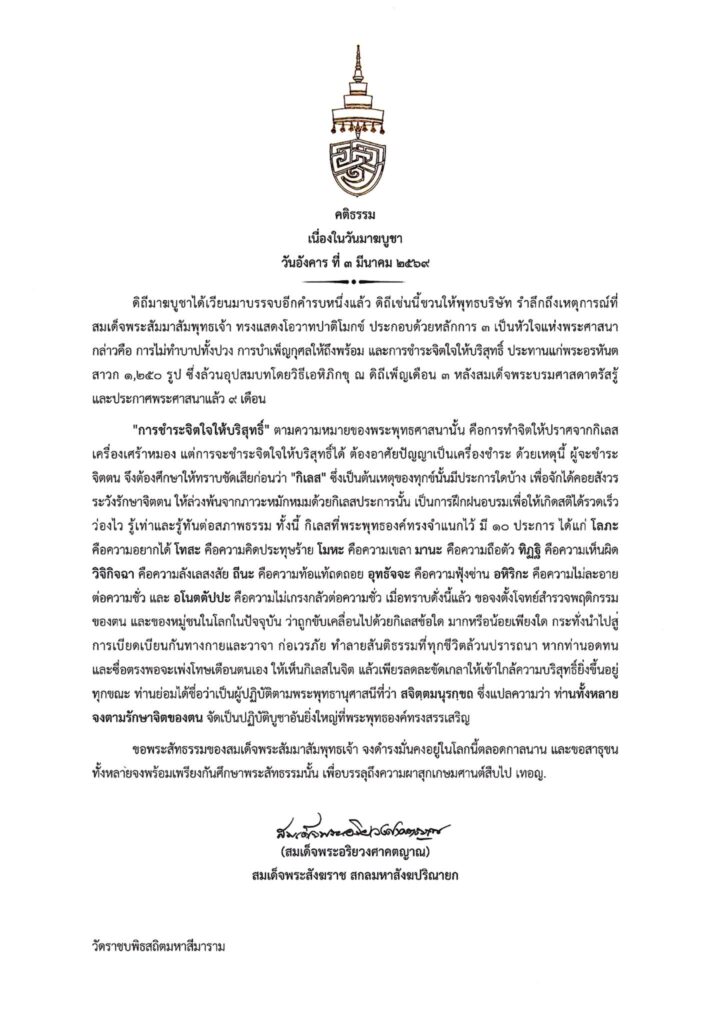 วันอังคาร ที่ 3 มีนาคม 2569 เจ้าพระคุณ สมเด็จพระอริยวงศาคตญาณ สมเด็จพระสังฆราช สกลมหาสังฆปริณายก ประทานพระคติธรรม เนื่องใน วันมาฆบูชา 3 กุมภาพันธ์ 2569 ความว่า