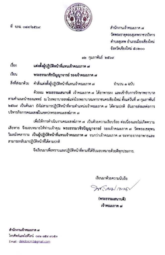 ด้วยผม พระธรรมเสนาบดี เจ้าคณะภาค ๗ ได้อาพาธลง และเข้ารับการรักษาพยาบาล ตามคำแนะนำของแพทย์ ณ โรงพยาบาลสงฆ์แห่งโรงพยาบาลมหาราชนครเชียงใหม่ ตั้งแต่วันที่ ๗ กุมภาพันธ์ ๒๕๖๙ เป็นต้นมา ยังไม่สามารปฏิบัติหน้าที่ตามตำแหน่งเจ้าคณะภาค ๗ ได้ตามปกติ อันอาจส่งผลต่อการบริหารกิจการคณะสงฆ์ในเขตปกครองคณะสงฆ์ภาค ๗